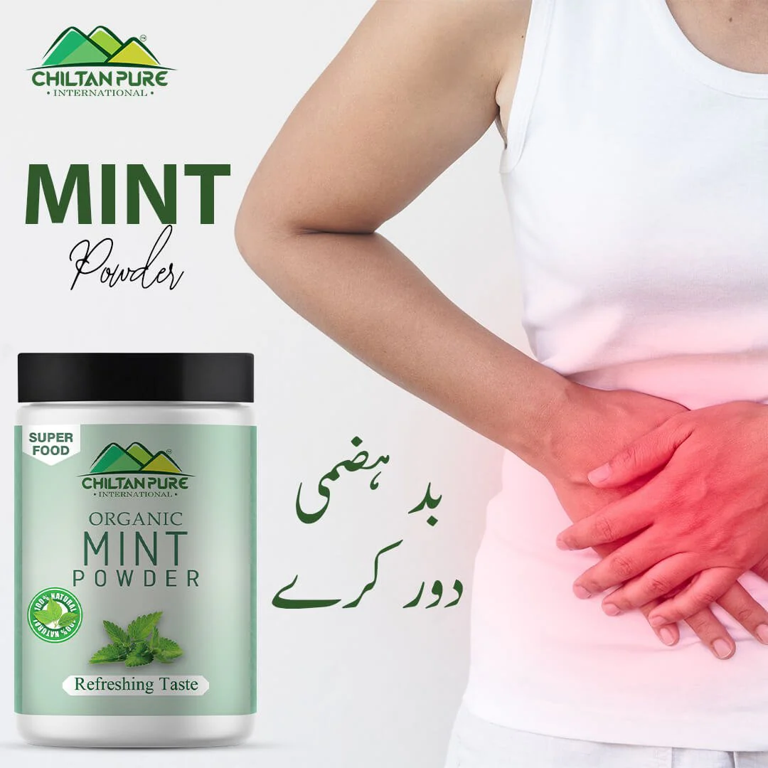 Chiltanpure Organics brings purity assured Mint Powder with ultra-Fine Quality. are considered an aid to the digestive system. It is an appetite stimulant and aids in the secretion of gastric juices. It was originally used as a medicinal herb to treat stomach ache and chest pains and it is commonly use in the form of tea as a home remedy to help alleviate stomach pain.
